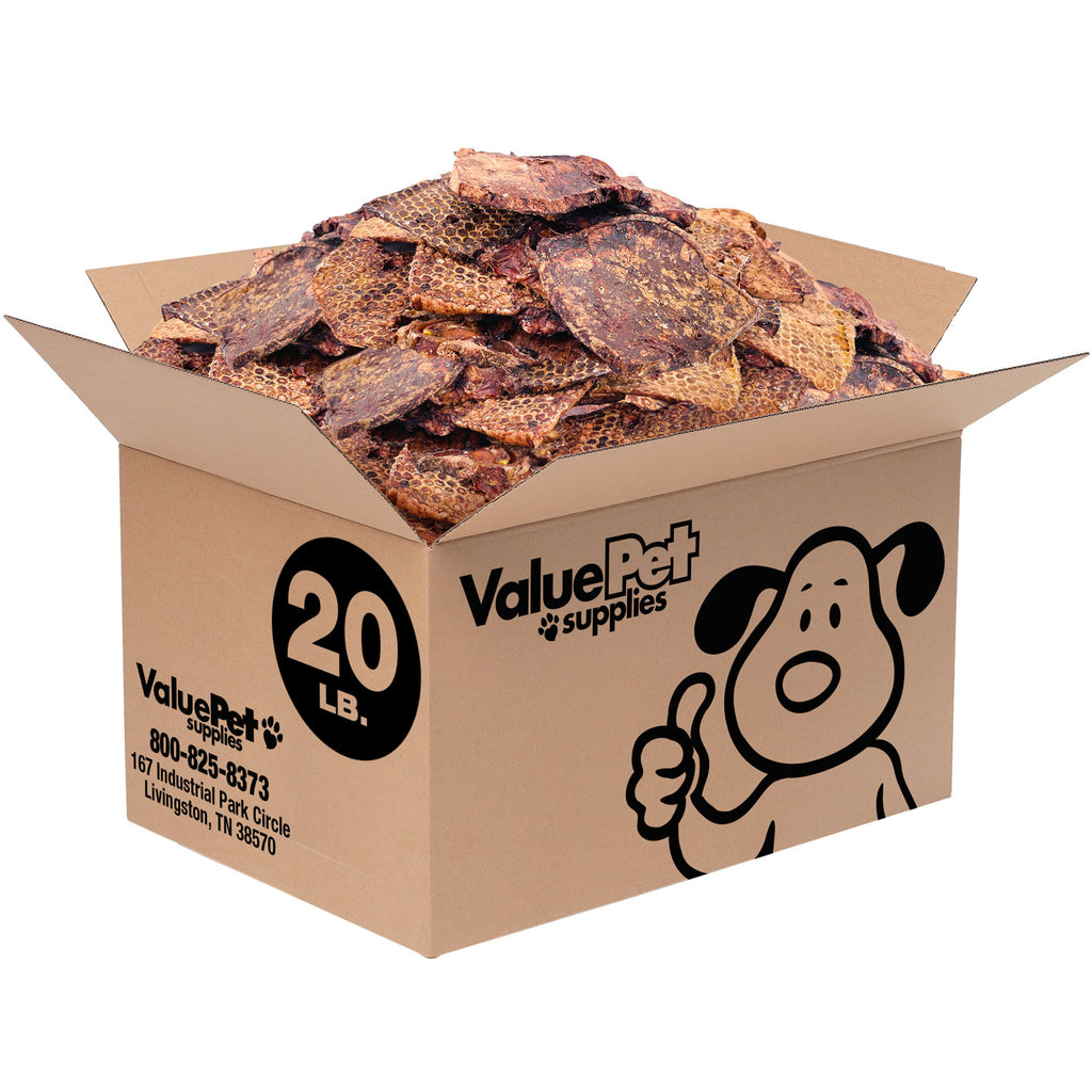 ValueBull Beef Lung Wafers are grain free and dehydrated treats that your dog will love. They are made with only a single ingredient: beef lung. This means they have no additives or harmful chemicals that could harm your dog's health. They are also fully digestible and tummy friendly for your dog. These treats are perfect as a training reward, because they are lightweight and easy to break up into snack-size pieces. They won't crumble into tiny pieces that could make a mess. They also help keep your dog's teeth and gums healthy by providing a natural chewing action. ValueBull Beef Lung Wafers are natural treats that will vary in size and shape with each wafer. Your dog will enjoy the full flavor and nutritional benefits of these beefy treats.