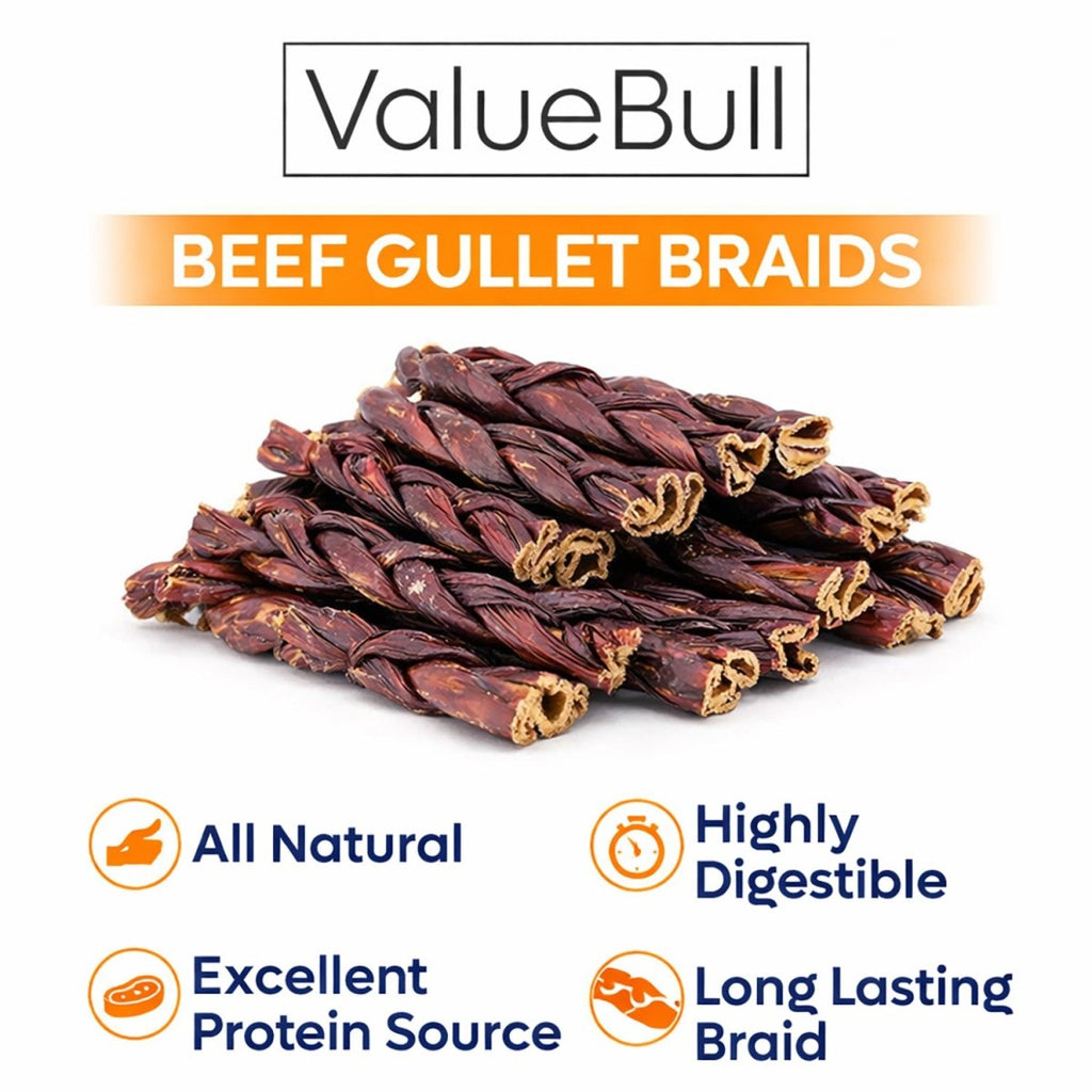 Naturally Satisfying Chew with Built-In Health Benefits ValueBull 6 Inch Beef Gullet Braids are flavorful, aromatic, and designed to keep your dog engaged and satisfied. Made from a single ingredient – 100% natural beef esophagus, these rawhide-free chews contain natural collagen, which helps support healthy joints, skin, and a shiny coat.