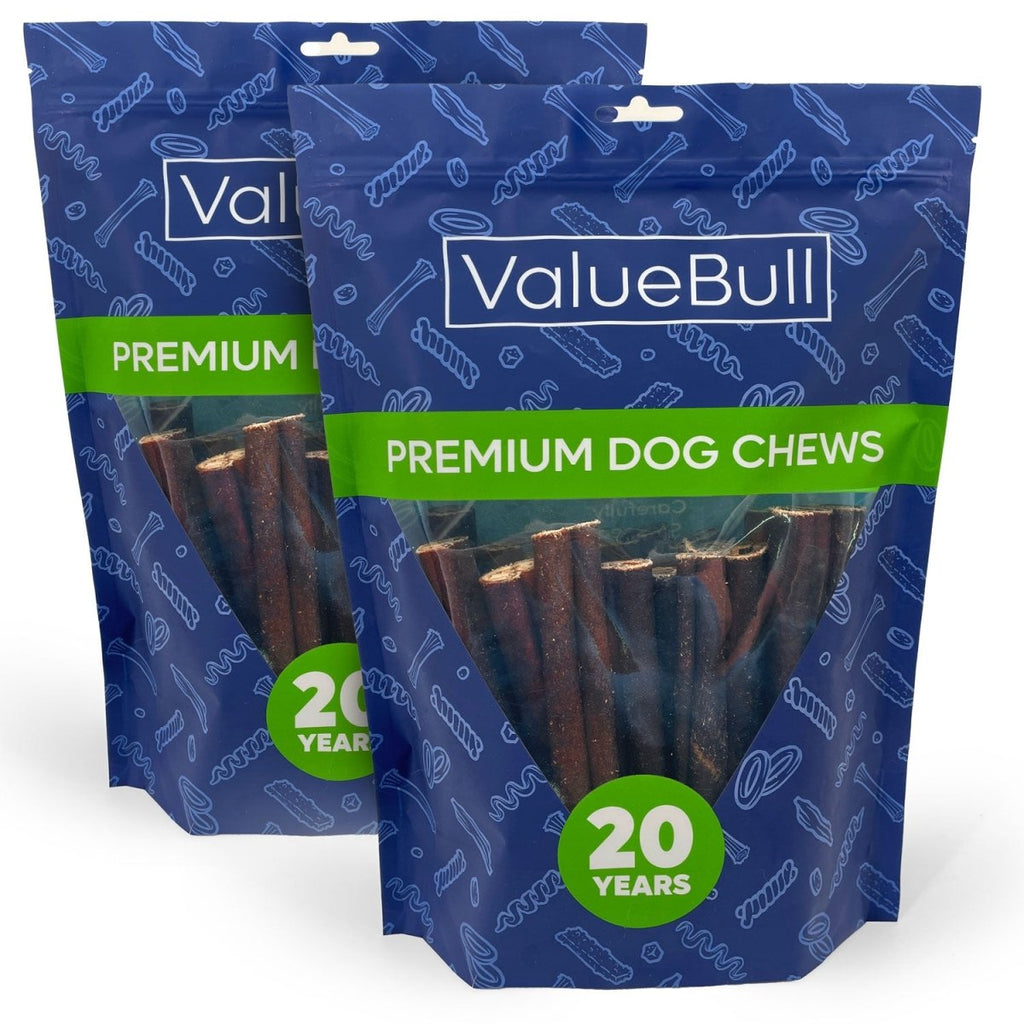ValueBull Beef Collagen Sticks will keep your dog jumping like a puppy. Like our famous bully sticks, this healthy collagen beef stick is long-lasting with a flavor and odor your dog will absolutely crave, plus the added benefits of collagen's proven support for bone and joint health. These easily digestible dog chew treats are produced without harmful additives or chemicals and may support healthy joints, skin, and coat. Beef corium comes from the bottom-most layer of the beef hide, providing a challenging chew-time puzzle to keep those busy jaws away from your slippers. These all-natural treats are hand-inspect for quality and consistency; some natural variation is to be expected.