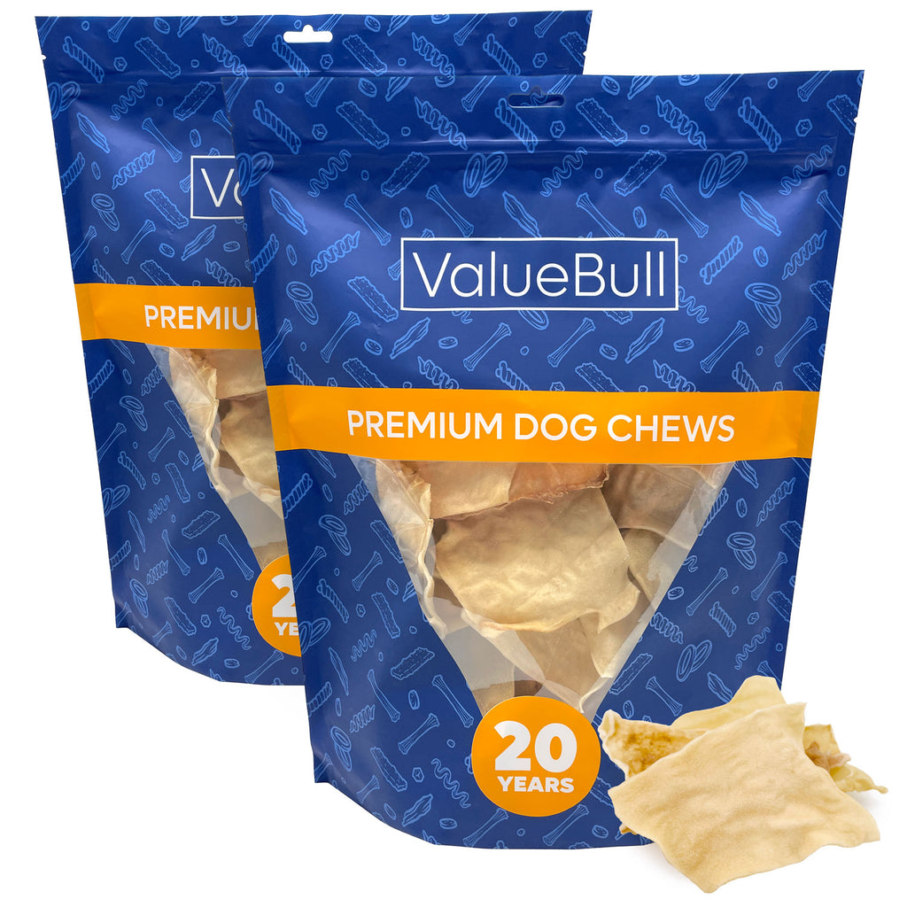 ValueBull USA Natural Flavored Beef Collagen Chips are made from a single sheet of corium, the inner layer of beef skin rich in collagen. Collagen helps your dog in many ways: it cleans their teeth and strengthens their jaw muscles, it rebuilds and repairs their muscles, it reduces inflammation, it supports their bones and joints, and it improves their skin and coat. These treats are long-lasting, basted in beefy broth, and highly digestible. We hand inspect all-natural treats for quality and consistency; some natural variation is to be expected. Quantity is estimated based on average weight.
