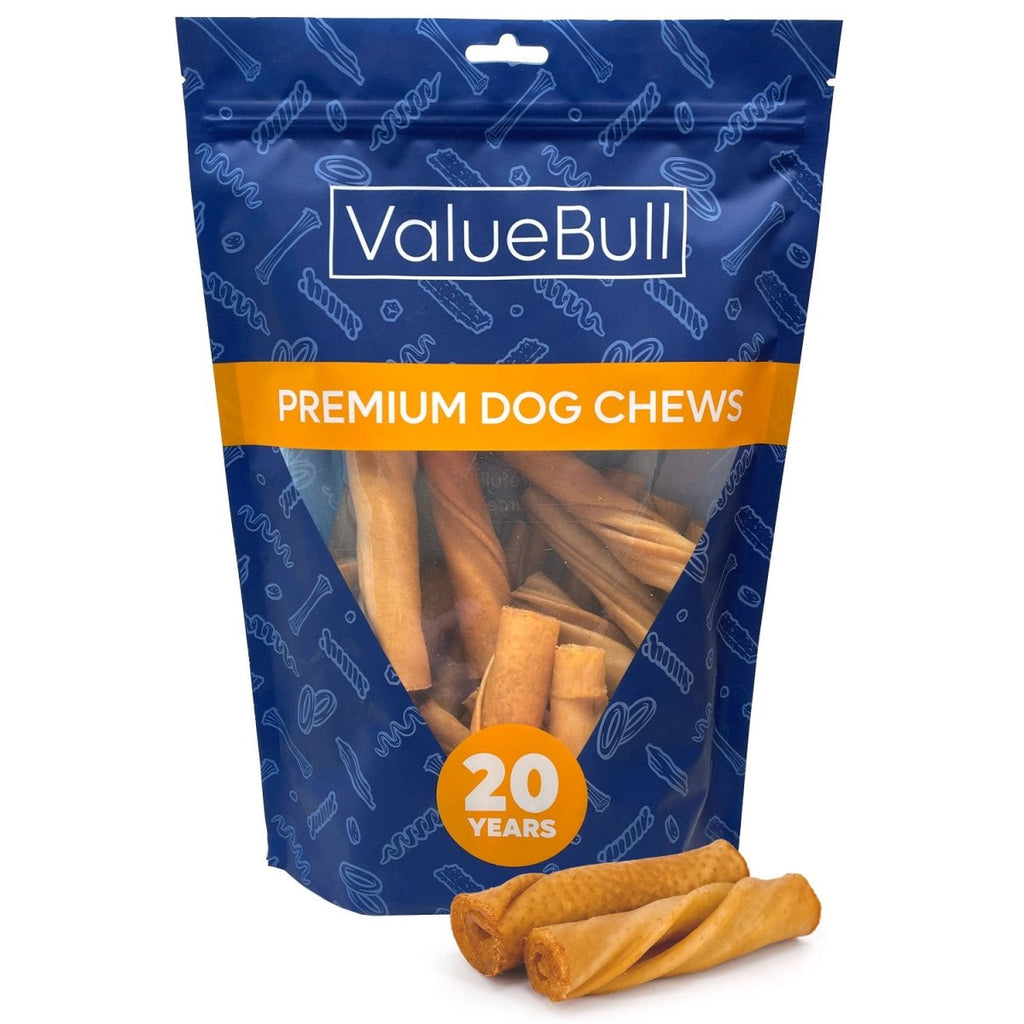 Keep your furry chew-machine occupied and happy with ValueBull Pig Skin Twist Treats. Pork hide dog chews are 100% USA pork hide providing a challenging chewing experience in a highly digestible and flavorful form. When you open the resealable bag, don't be surprised if every dog in the neighborhood stops by to show you their best trick. The smoky aroma will drive your dog wild and keep them from giving even a moment's thought to that tempting dining room table leg.