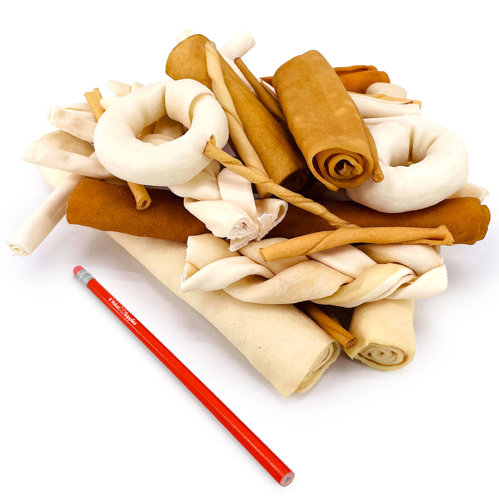 ValueBull USA Rawhide, a Varied Mix of Fun Shapes for Dogs is the perfect gift for your fur baby. Our rawhide dog treats provide an intriguing shapes to unravel over the course of a nice lengthy chew session that thankfully involves none of your shoes. Our dog treats have a full grain rawhide texture that effortlessly cleans away tartar and plaque. Variety pack will contain a variety of chews for a range of dog sizes for your dog to savor and enjoy. The bulk packs will contain the most variety.