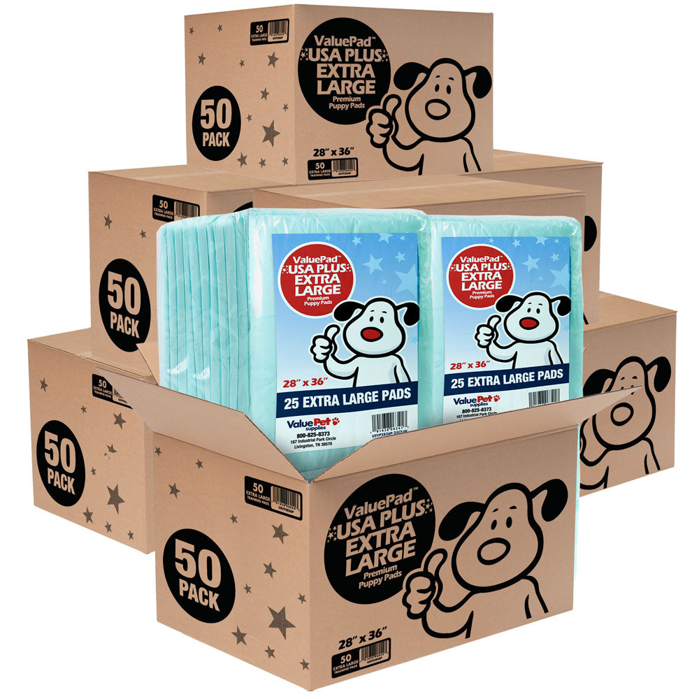 ValuePad USA PLUS Premium Puppy Training Pads will make training your puppy or caring for your senior dog simple and convenient. Featuring tear proof premium materials and a super absorbent polymer core that locks liquid into a gel, ValuePad American made pet pee pads are designed with convenience and reliability in mind. The stay-dry top layer won't snag nails which prevents tracking and the tough polymer backing helps prevent leaks. These top quality pet potty pads are great for house training, senior dogs, dogs in smaller apartments, or pets left alone during the day.